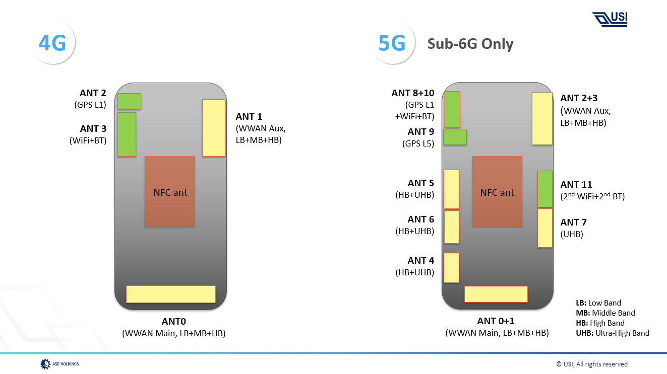 环旭电子机构设计团队凭借着多项项目经验,归纳出几项方案,例如天线的排布、散热方案以及如何腾出更多可用空间。首先,在下图中4G vs 5G的天线排布,两者就有相当大的设计差异。天线总数从5支暴增到了13支,新占据的空间主要在左右两侧,实际新增占位共5处。