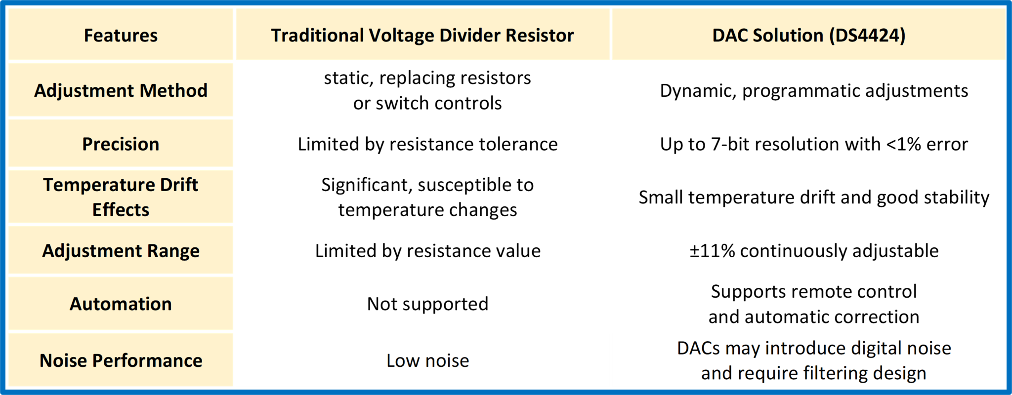 Because the DAC can be accurately adjusted through software, it avoids resistance errors and temperature drift problems, and supports automation.