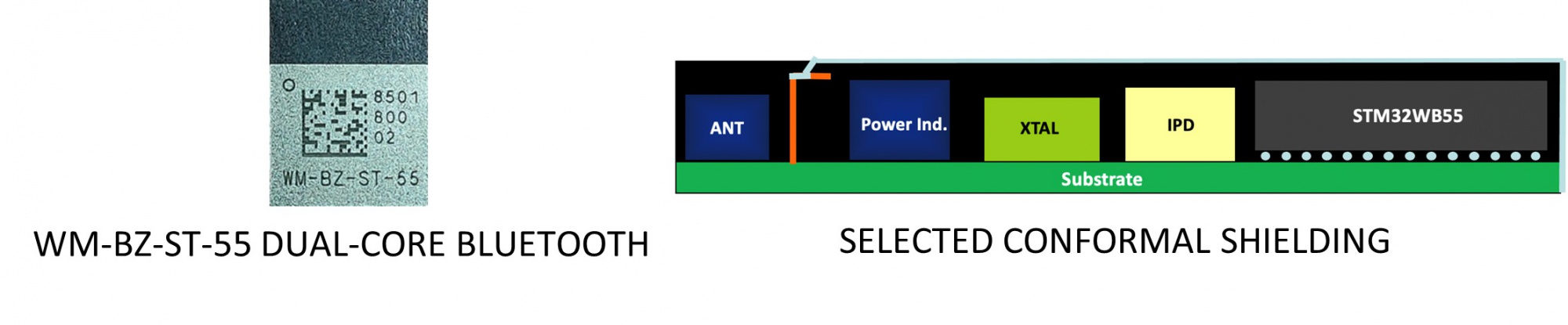 Measuring 7.2 x 9.3 x 0.96 mm in size, the WM-BZ-ST-55 AoP module features STMicroelectronics' STM32L4 Arm® Cortex®-M4 MCU with the Cortex-M0 + dedicated kernel-managed RF chip. This freestanding compact module is packaged with partial metal sputtering shielding, includes STMicroelectronics' (STM)STM32WB55 series RF SoC that supports BLE5.0, Zigbee and Thread wireless connection, incorporating BTLE and integrated with 2.4 GHz antenna.