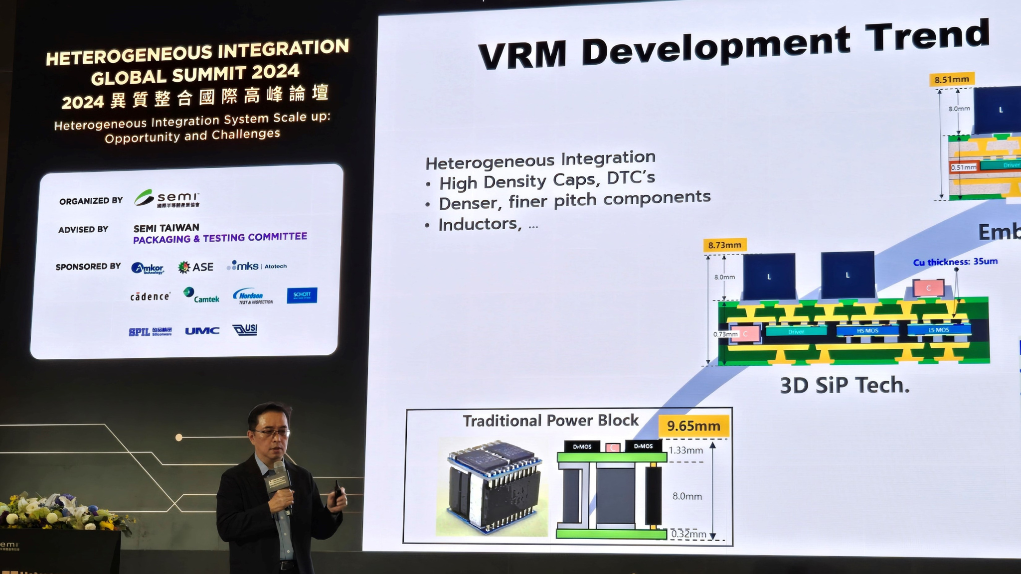 (2024-09-10) 9月5日,SEMICON Taiwan 2024 國際半導體展,環旭電子技術長方永城在「異質整合國際高峰論壇」上分享了尖端的整合式電壓調節模組(IVRM)技術,這項創新技術將為人工智慧(AI)和機器學習(ML)的高效能運算提供動力。