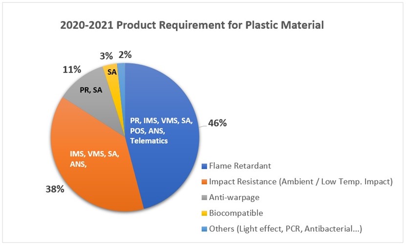 從USI環旭電子的調查,我們看到過去幾年產品塑膠材料的需求主要以耐燃材料最常見(43%)、其次為耐衝擊(36%)及抗翹曲(19%)。自2020年以來塑膠材料的運用越來越多元,由於環保意識抬頭及疫情因素,抗菌材料、消費後回收料(PCR)需求增多,生物相容性材料的使用也由於穿戴式產品需求而增加。